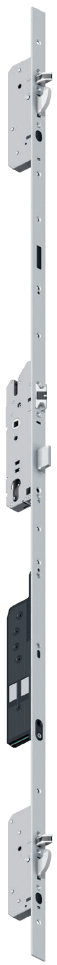 Mechanisch verriegelnde Schwenkriegel, motorisch öffnend. Die Entriegelung von innen erfolgt über den Türdrücker oder über die Haussprechanlage (die E-Öffner-Lösung).